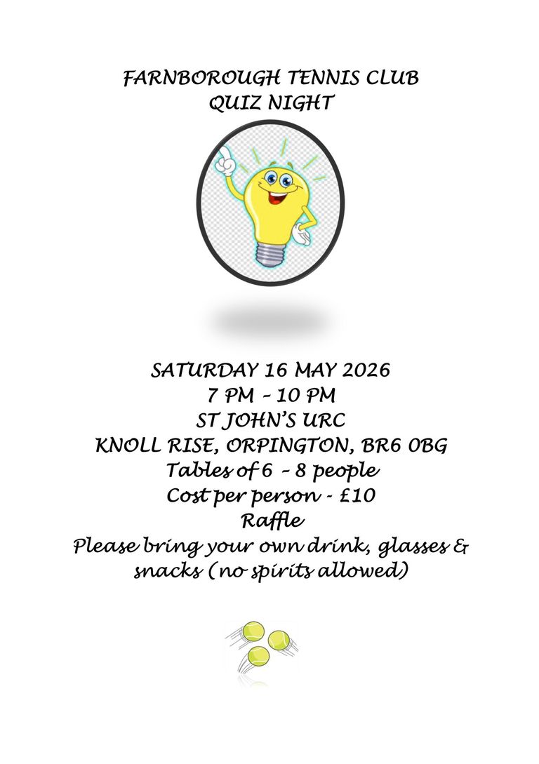We can also confirm our club Quiz Night, which is booked for 7:00-10:00pm on Saturday 16th May at St John’s Church, Knoll Rise in Orpington (see flyer below). Entries are for teams of 6-8 people and the cost is £10 per person. Please bring your own drinks, glasses and snacks (no spirits allowed) and there will also be a raffle on the evening. The event is open to members and non-members, so please bring along your family and friends to enjoy a fun and sociable evening out.