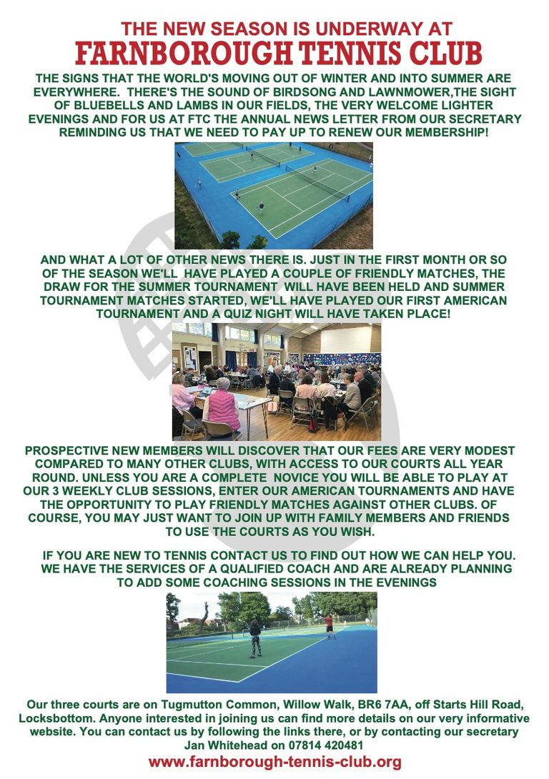 Our first fixtures are for two Men’s Doubles matches against Hayes, home and away. The first match is at Farnborough from 12:30 to 4:00pm on Tuesday 7th April, so the courts will be unavailable to members during that period.
