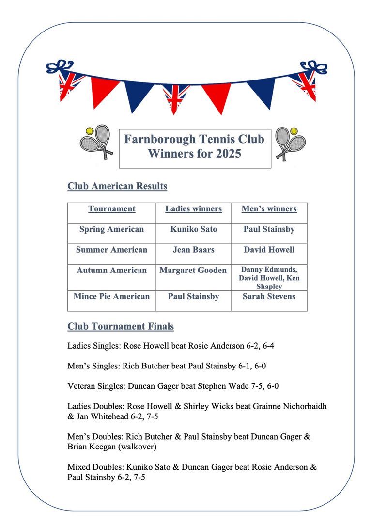 Formats suggested included one-day events, tie-break tournaments & short-set formats. A query was raised at the AGM about the way the tournament draws are conducted each April. This was specifically with regards to the need for at least some seeding arrangements, to keep stronger players apart in the early rounds and to even out the doubles pairings. The Committee agreed to take this into account for next years’ tournament draws.