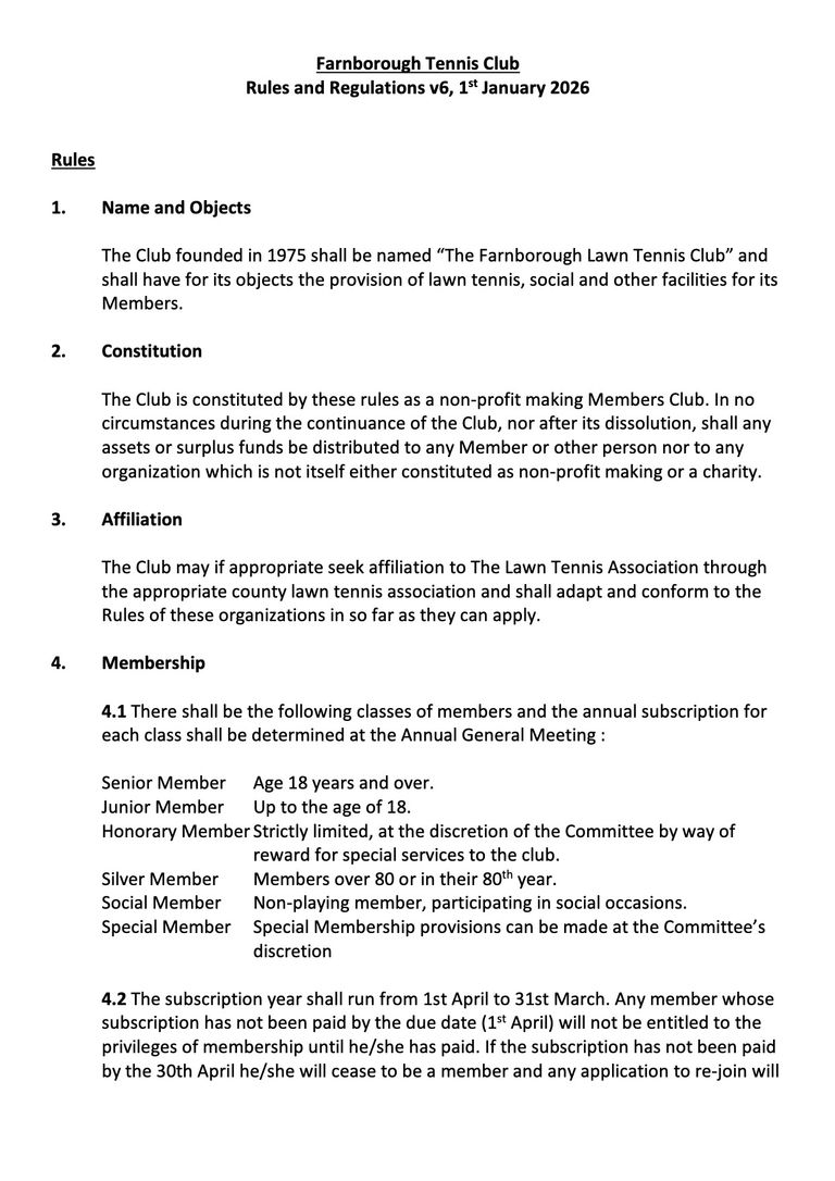 All Members of Farnborough Tennis Club are obliged to abide by the Club Rules and Regulations.