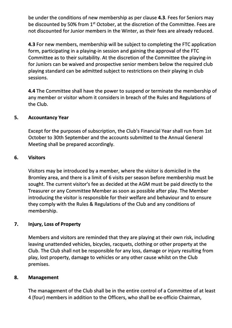 Members and visitors are reminded that they are playing at their own risk, including leaving unattended vehicles, bicycles, racquets, clothing or other property at the Club. The Club shall not be responsible for any loss, damage or injury resulting from play, lost property, damage to vehicles or any other cause whilst on the Club premises.